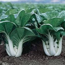 (Brassica rapa chinensis) Thick white stems with large, flat, round, smooth, green leaves. Popular variety.